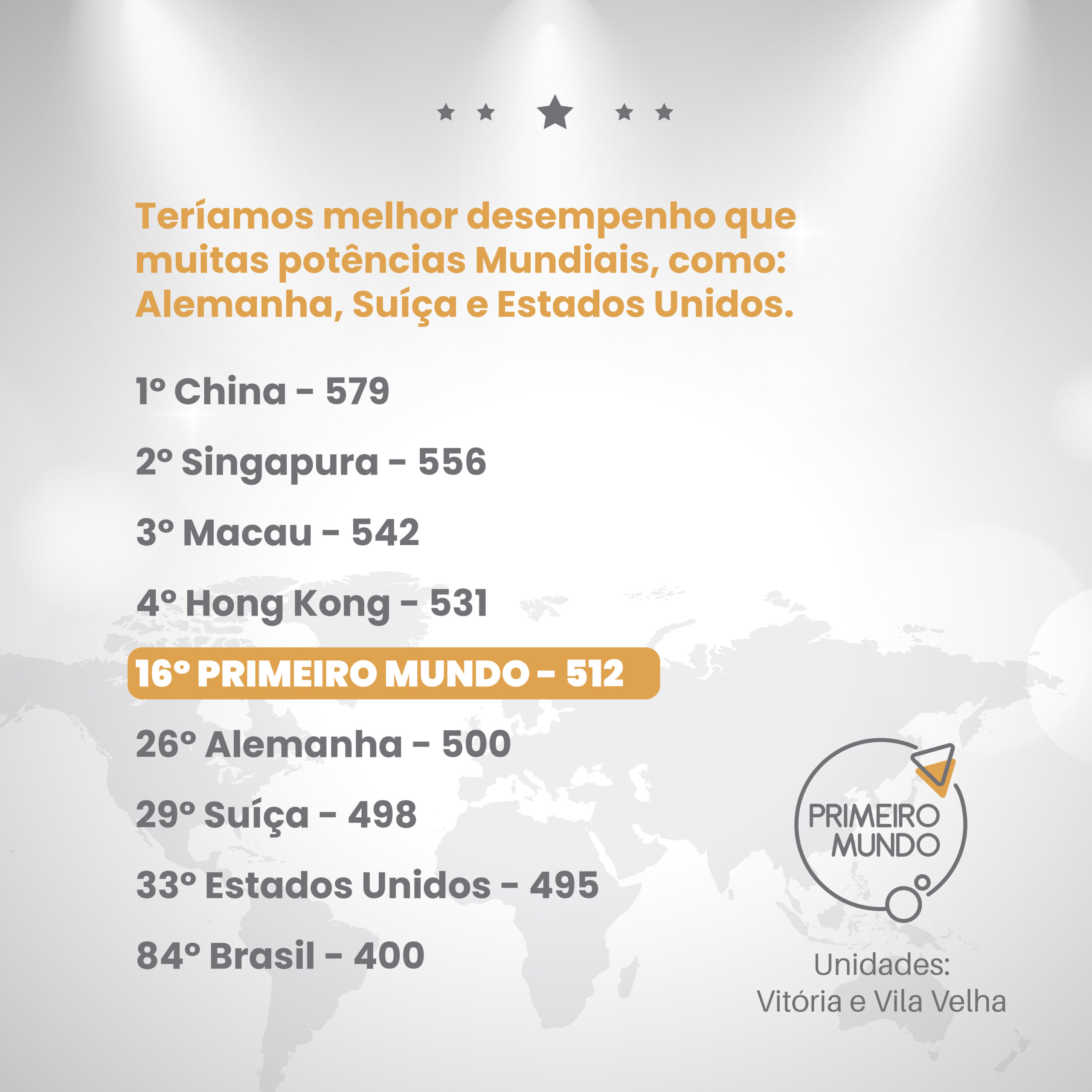 O Primeiro Mundo teve excelente desempenho no PISA-S 2022 e, se fôssemos um país, estaríamos à frente de outros como: Alemanha, Suíça, Estados Unidos, França, Portugal e Itália. Nós atingimos 512 pontos, número bem superior à média brasileira, que é de 400 pontos. 🤩🌎
